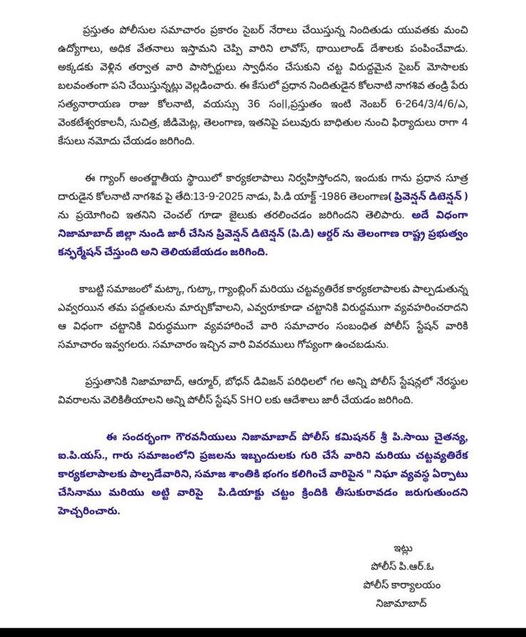 Nizamabad, October 12, 2025: A resident of Nagaram village in Bodhan mandal of Nizamabad district, Kolanati Nagashiva (36 years old), who deceived unemployed youth and transported them to countries like Laos and Thailand to involve them in criminal online cyber fraud activities, has been issued a Preventive Detention (P.D.) Act - 1986 order by the Telangana State Government. Accordingly, the accused has been transferred to Chanchalguda Jail.