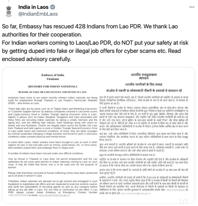 Press NoteIndian Embassy in Laos has given repeated Advisory on Illegal Recruitment in Scam Compounds
